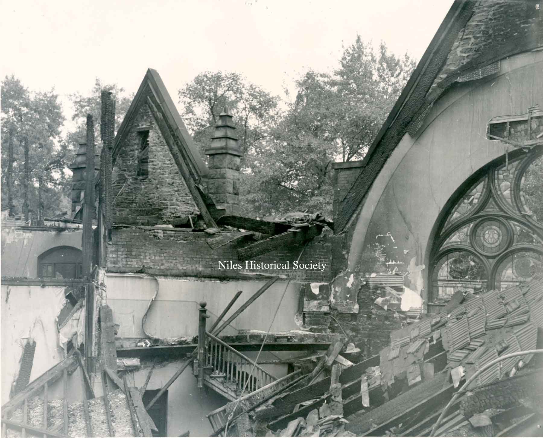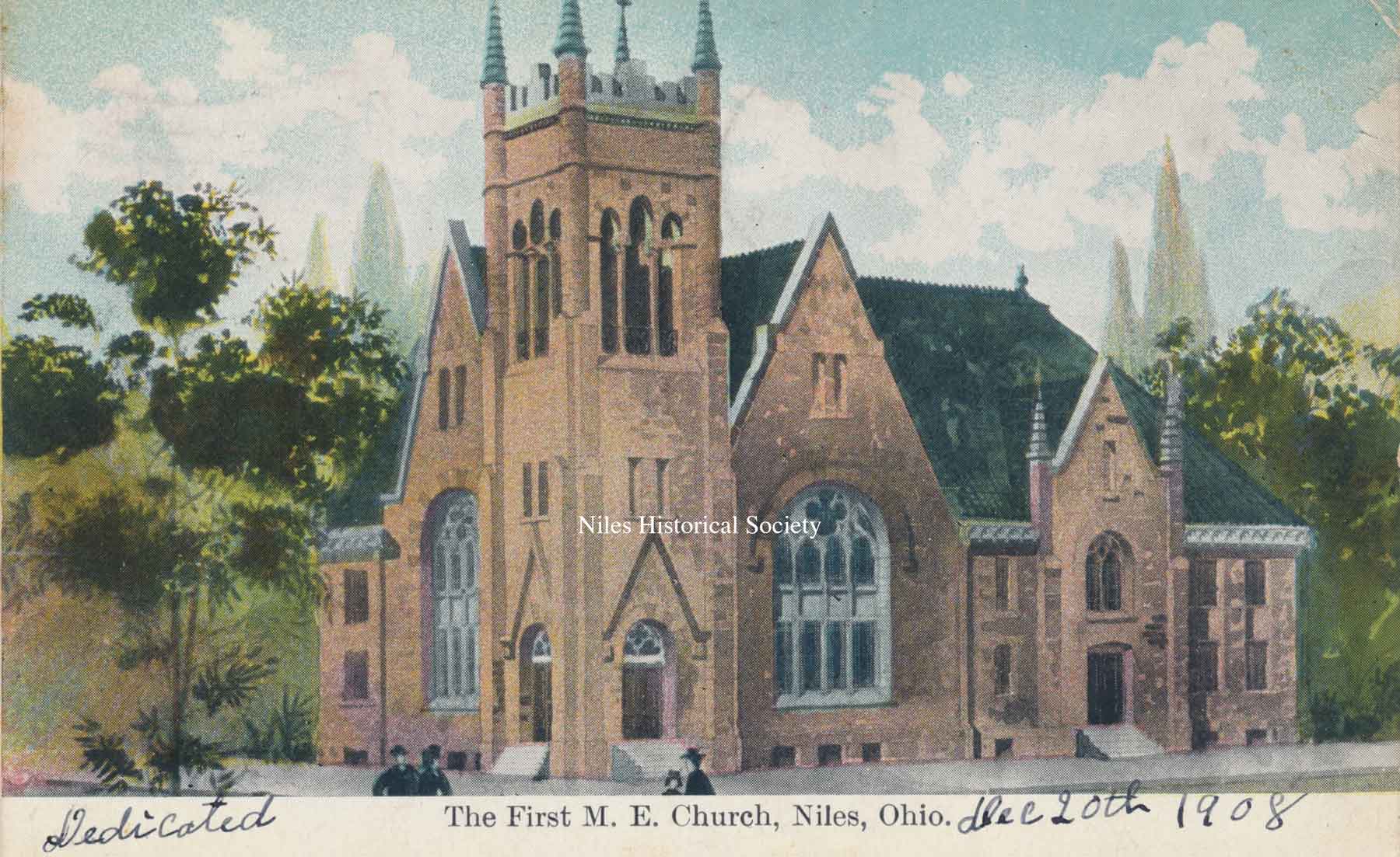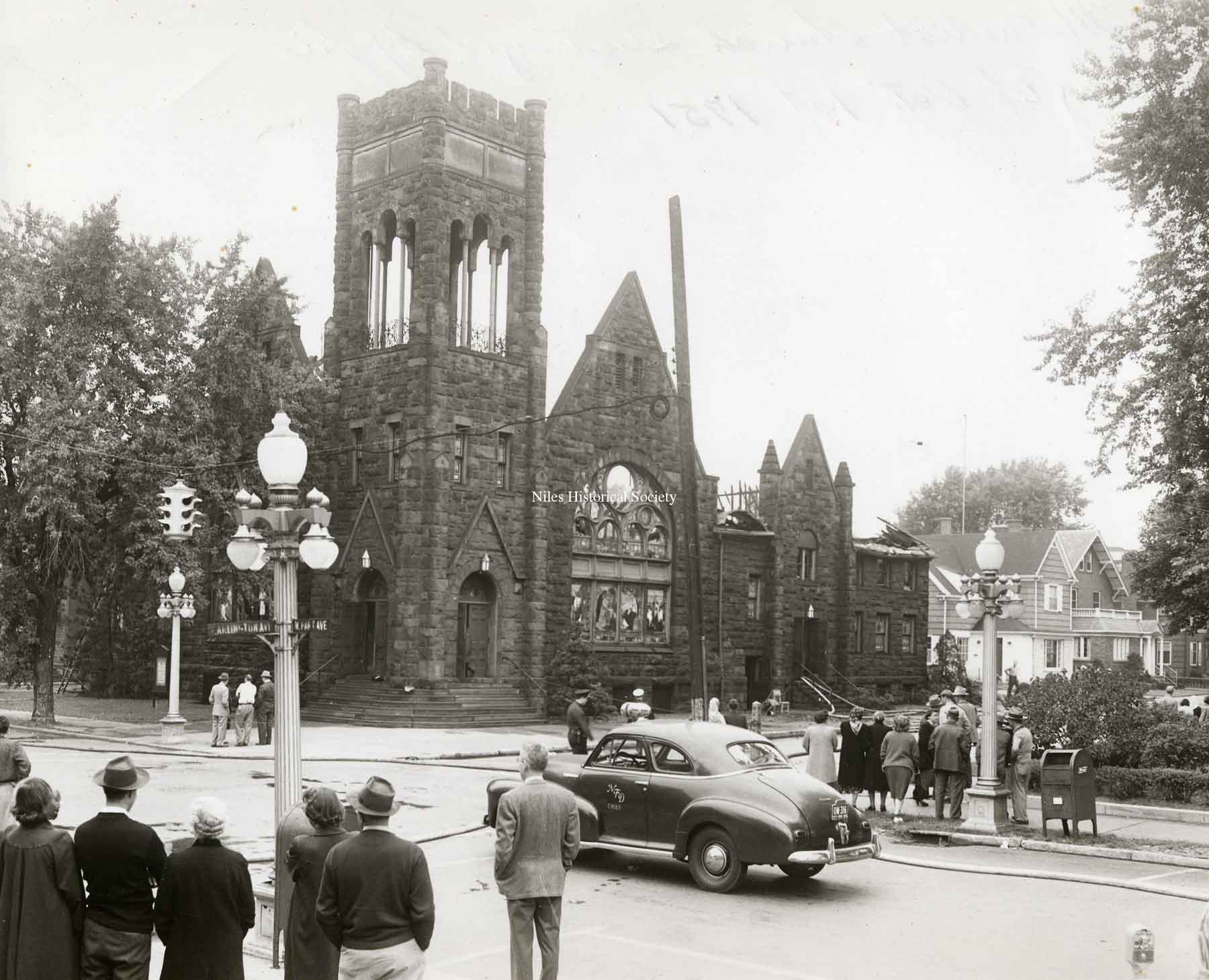 Picture of the Methodist Episcopal Church in Niles located on the corner of West Park Avenue and Arlington Street. This building replaced the frame church that burned in 1883, and was dedicated in 1908. It was used by the Methodist community until it too was destroyed by fire in 1951.