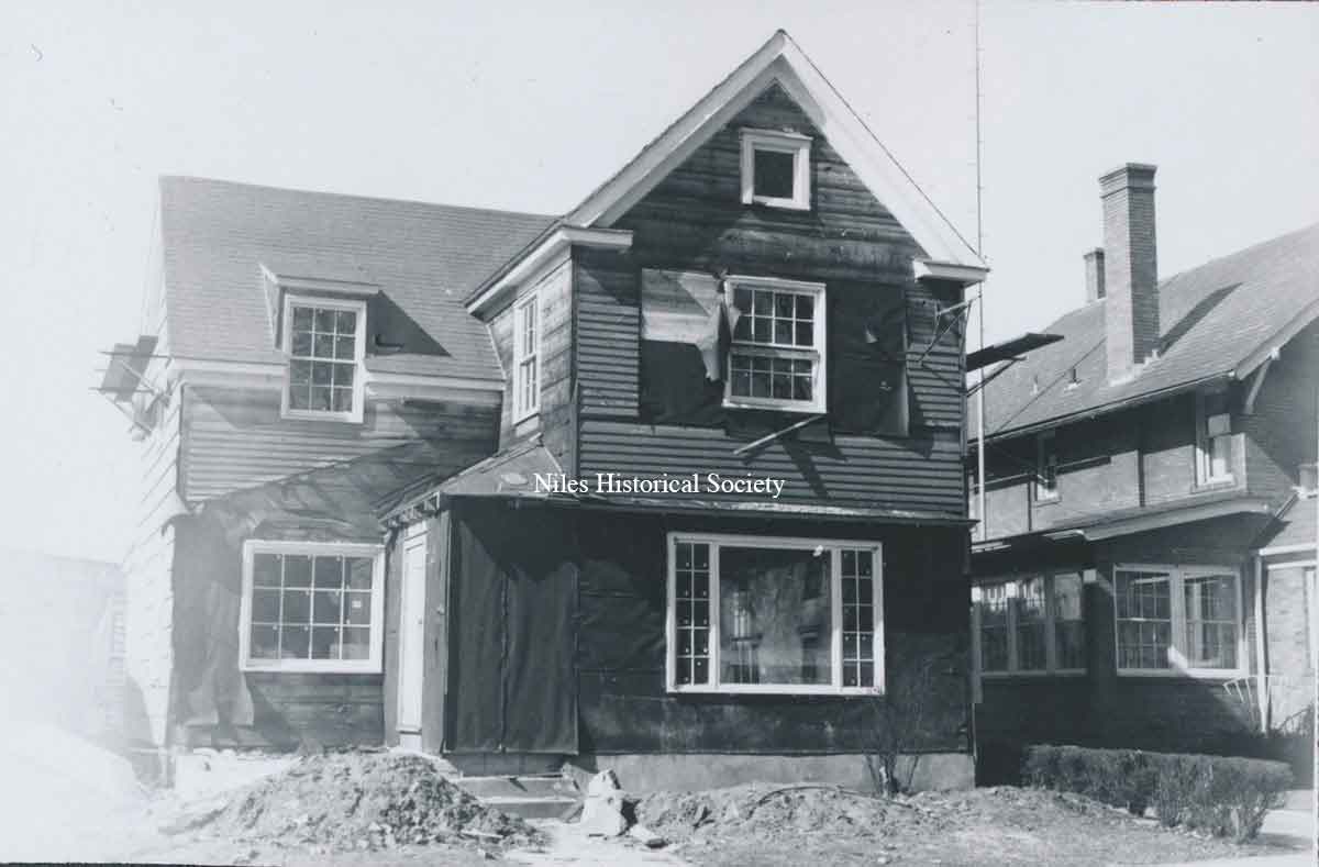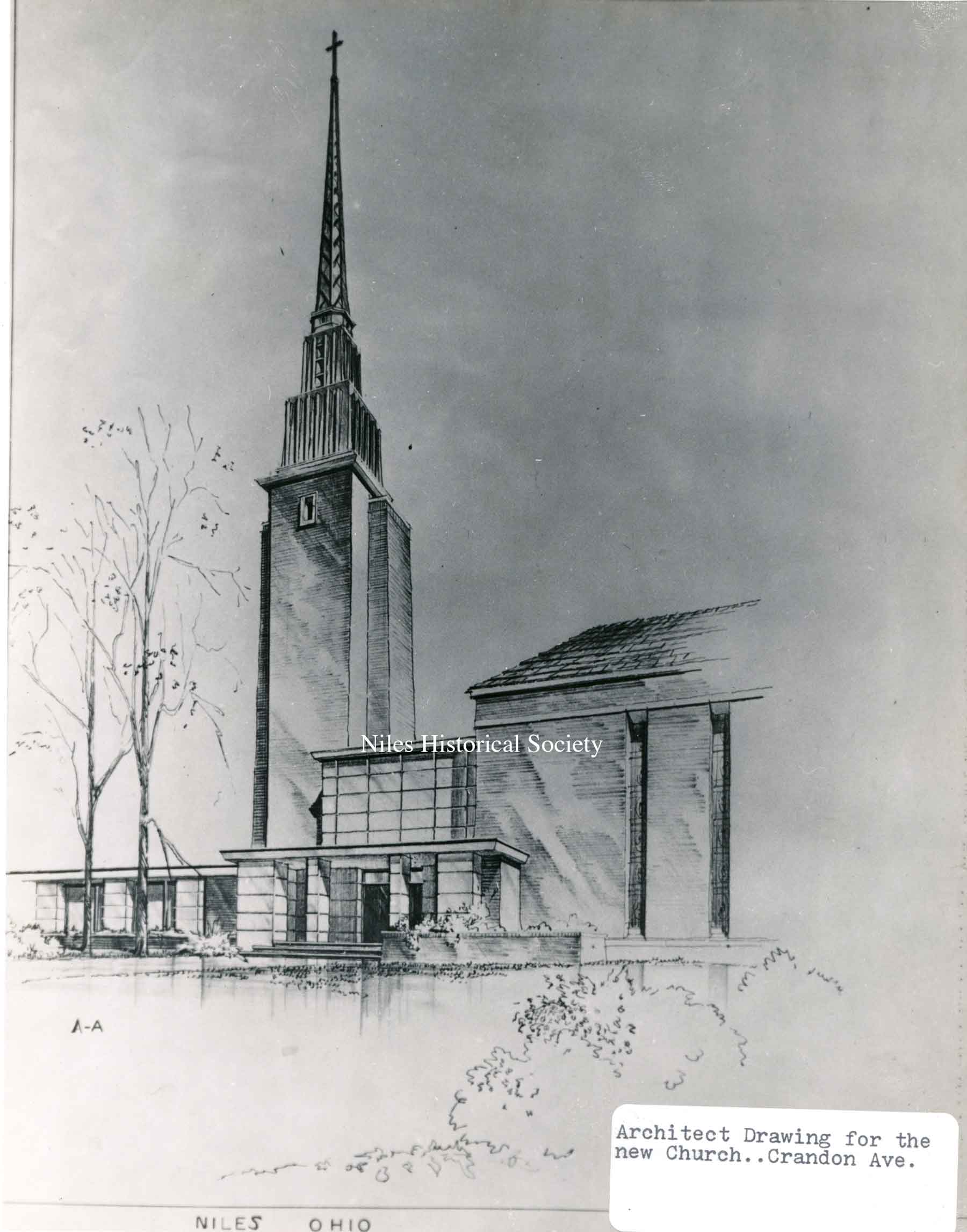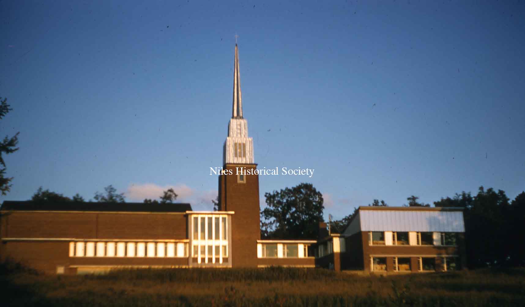 Picture of the Methodist Episcopal Church in Niles located on the corner of West Park Avenue and Arlington Street. This building replaced the frame church that burned in 1883, and was dedicated in 1908. It was used by the Methodist community until it too was destroyed by fire in 1951.
