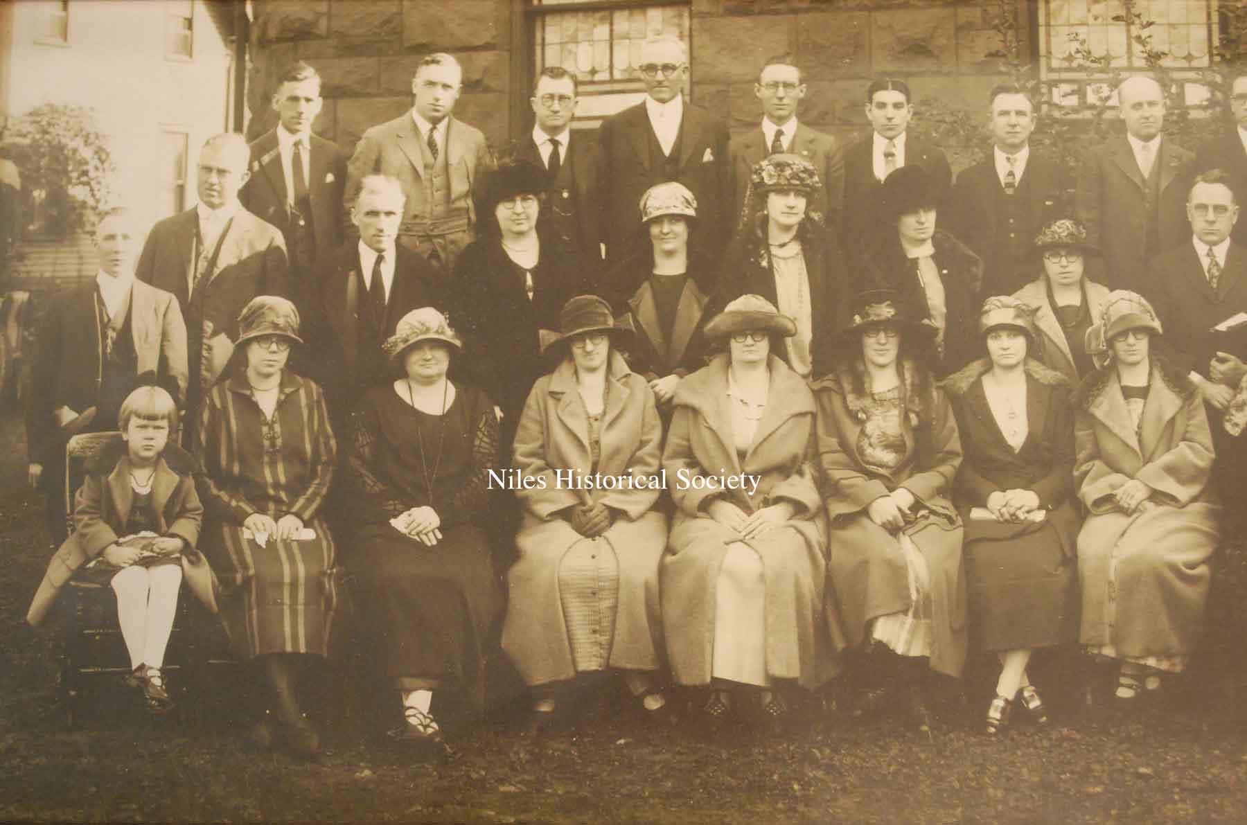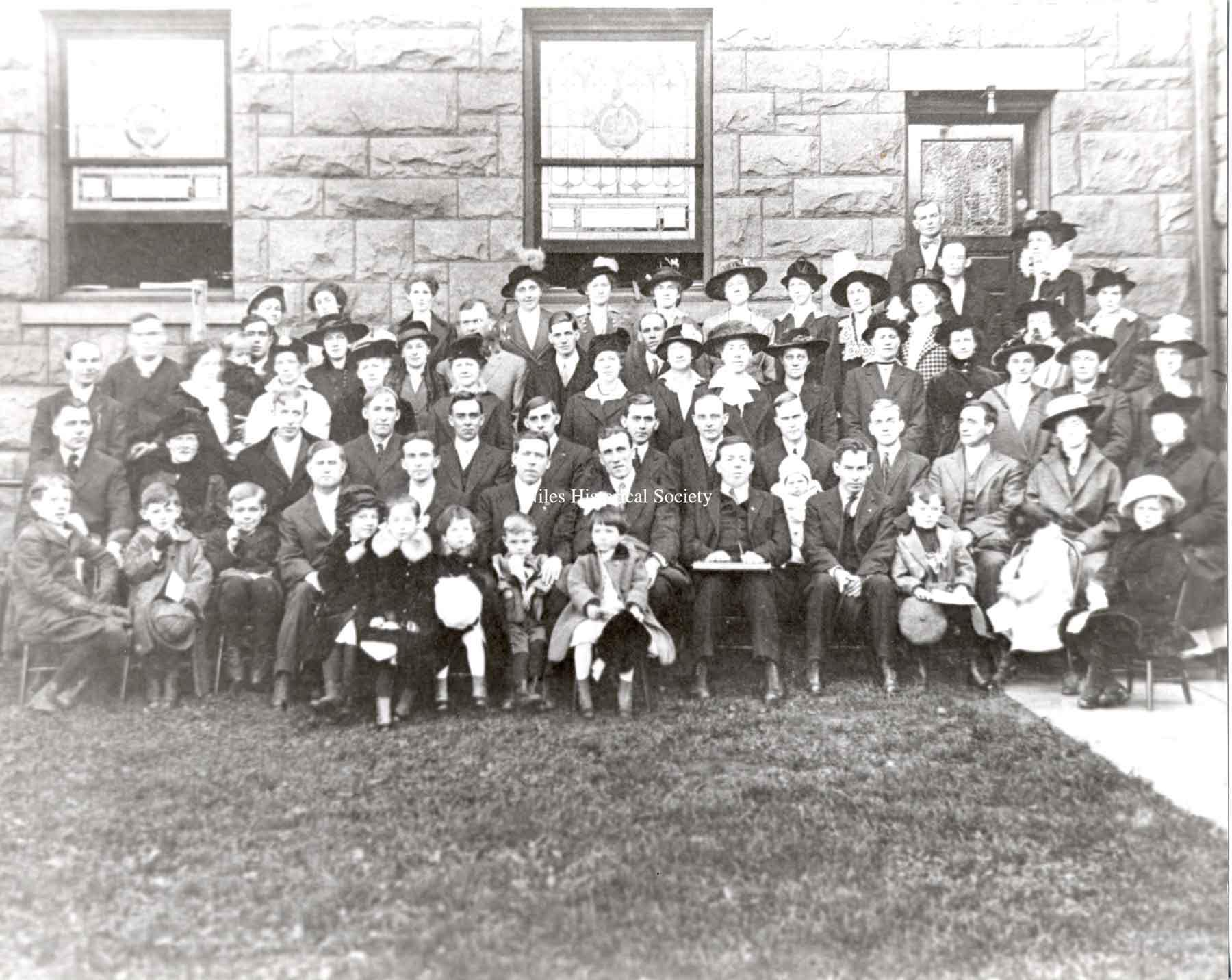 The 1915-16 Methodist Church picnic. Ernst T. Law is holding his daughter Venita Law Heinmiller. His wife, Hazel Hanson Law, is the lady in the third row on the right side in a hat with white trim.