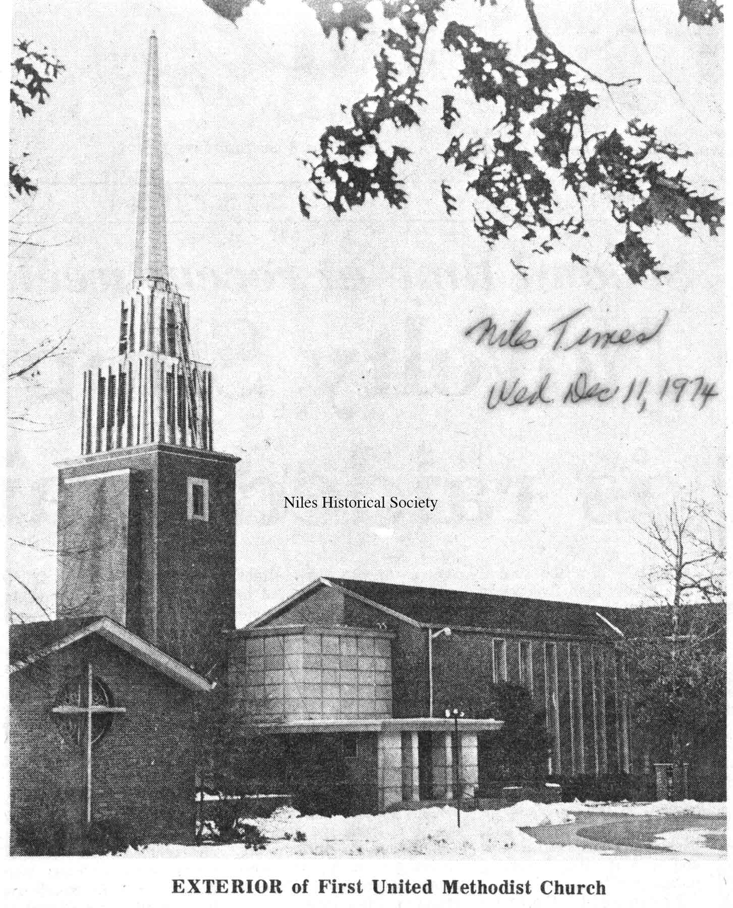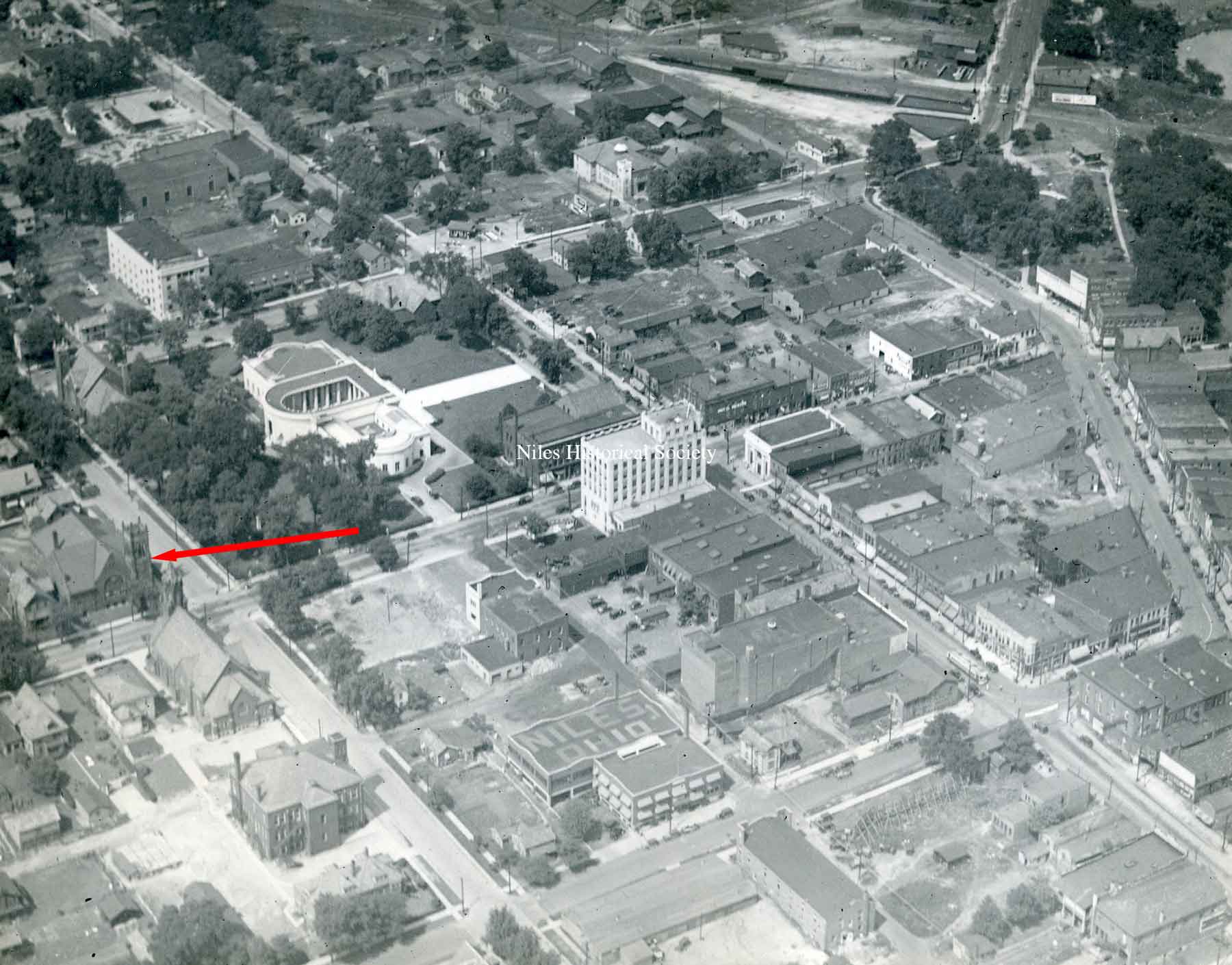 Aerial view of downtown Niles. Red arrow indicates location of First Methodist Church.