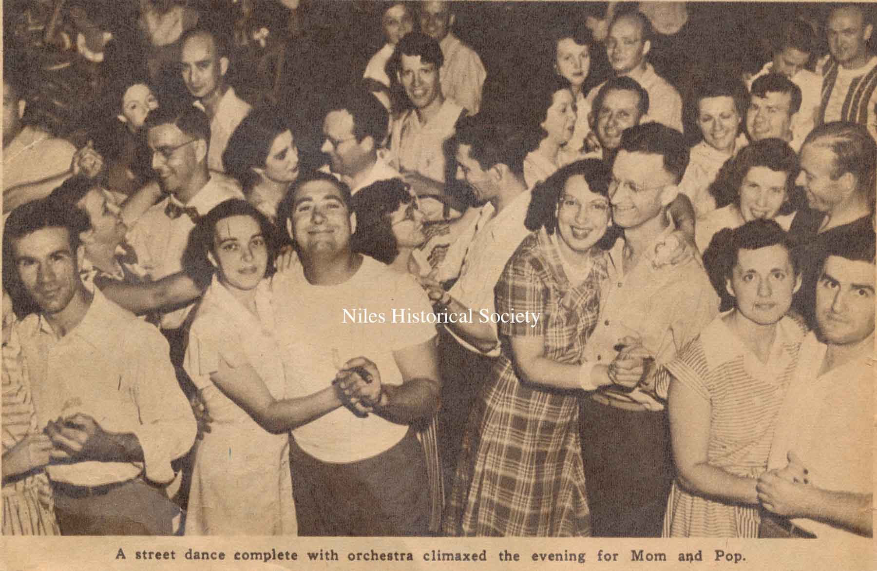 A street dance, with music climaxed the evening for Mom and Pop. Ray Sanfrey is in the front row with white t-shirt.