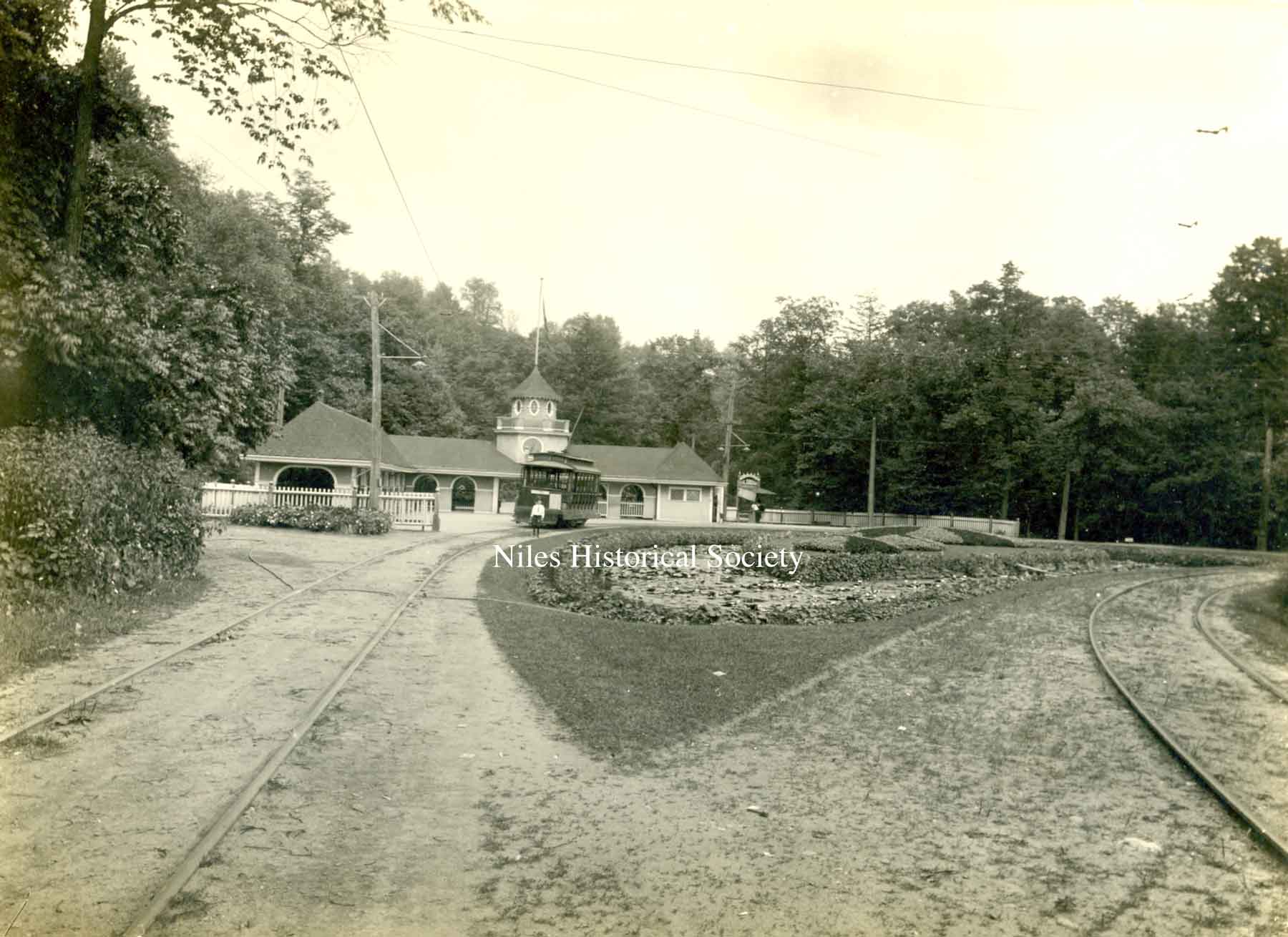 A view of the streetcar lines and admission gates at Riverside Amusement Park on the southwest corner of Route 46 and Salt Springs Road when streetcars were popular in the late 1880's and early 1900's.