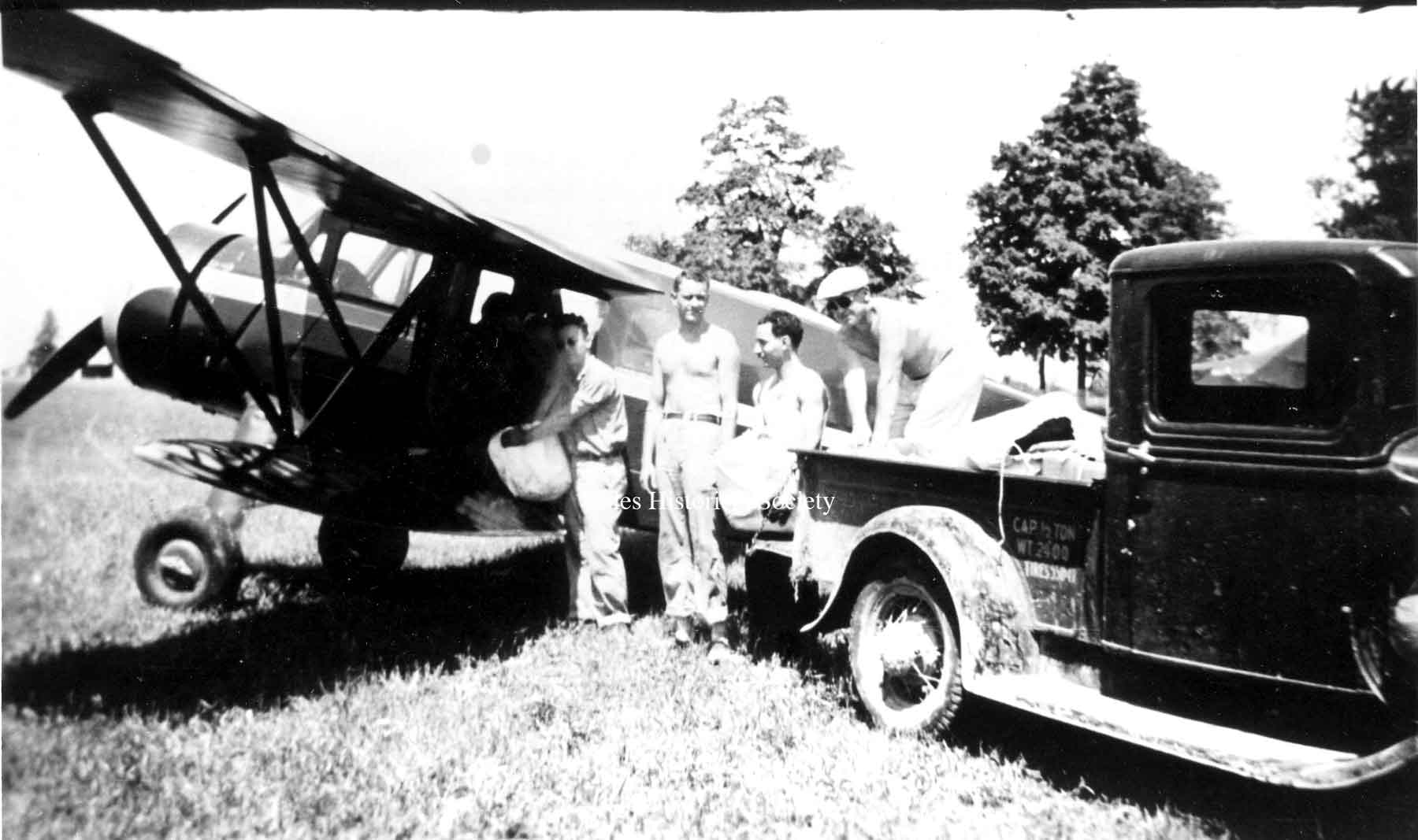 Pilots that flew food planes during the 1937 strike. L to R: B.T. Dyc, Safety Director Republic Steel; Ben I. Swineford, pilot; Frank Groat, pilot; L. Croft, pilot; P. Mood, pilot; J. W. Hunt, pilot Lic. No. 761045.