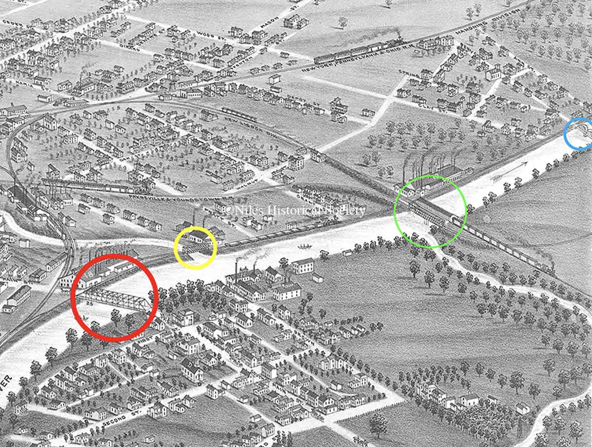 There are four bridges that cross either the Mahoning River or Mosquito Creek as shown on the 1882 panorama map of Niles.