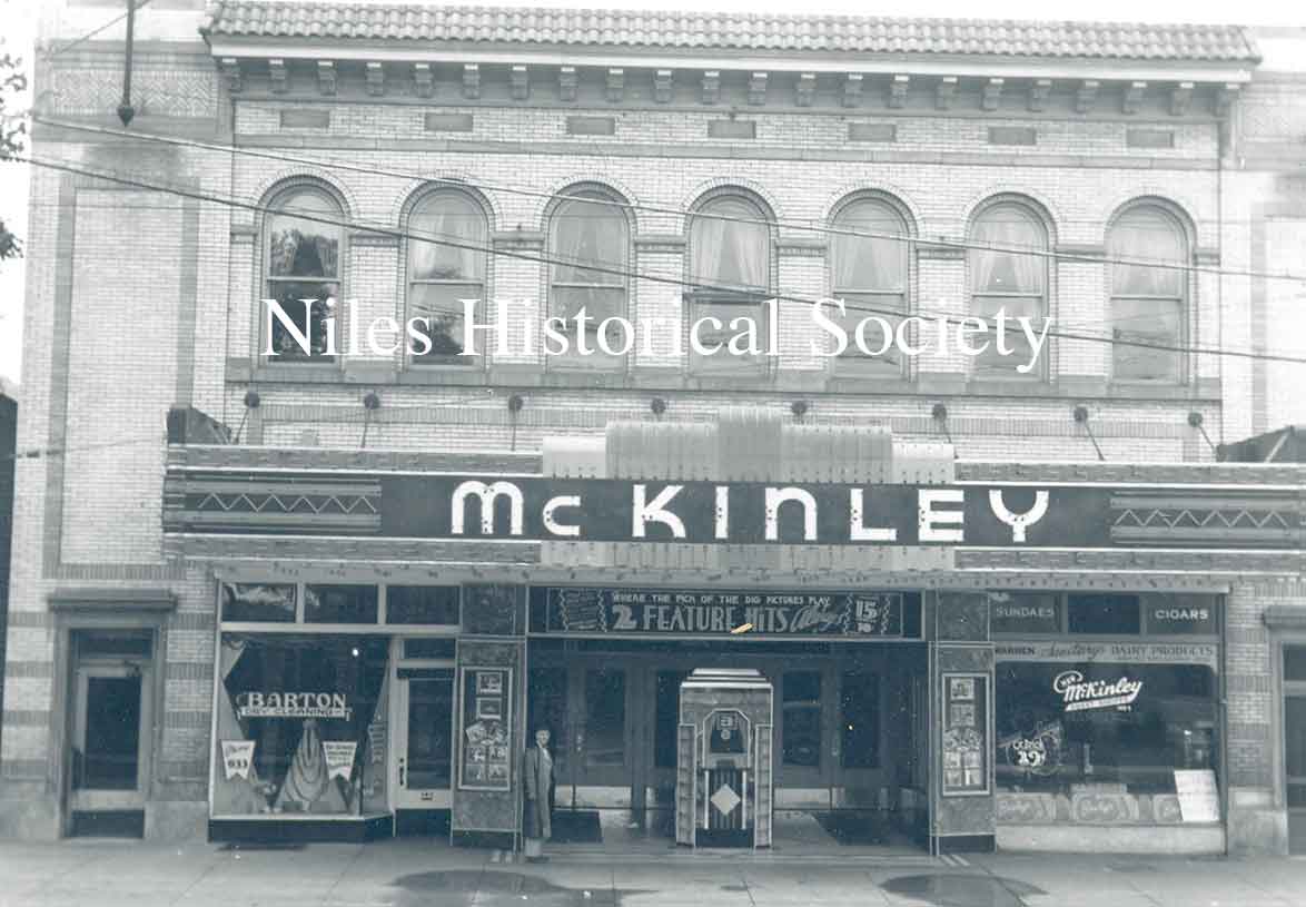 A picture of the McKinley Theatre when it was operating on South Main St. in downtown Niles. 1950 ca. Barton's Candy Store is on the left. In 1953 Jo Reese would open her first flower shop at this location. The McKinley Restaurant is on the right side of the theatre's entrance. The theatre would close in 1960.
