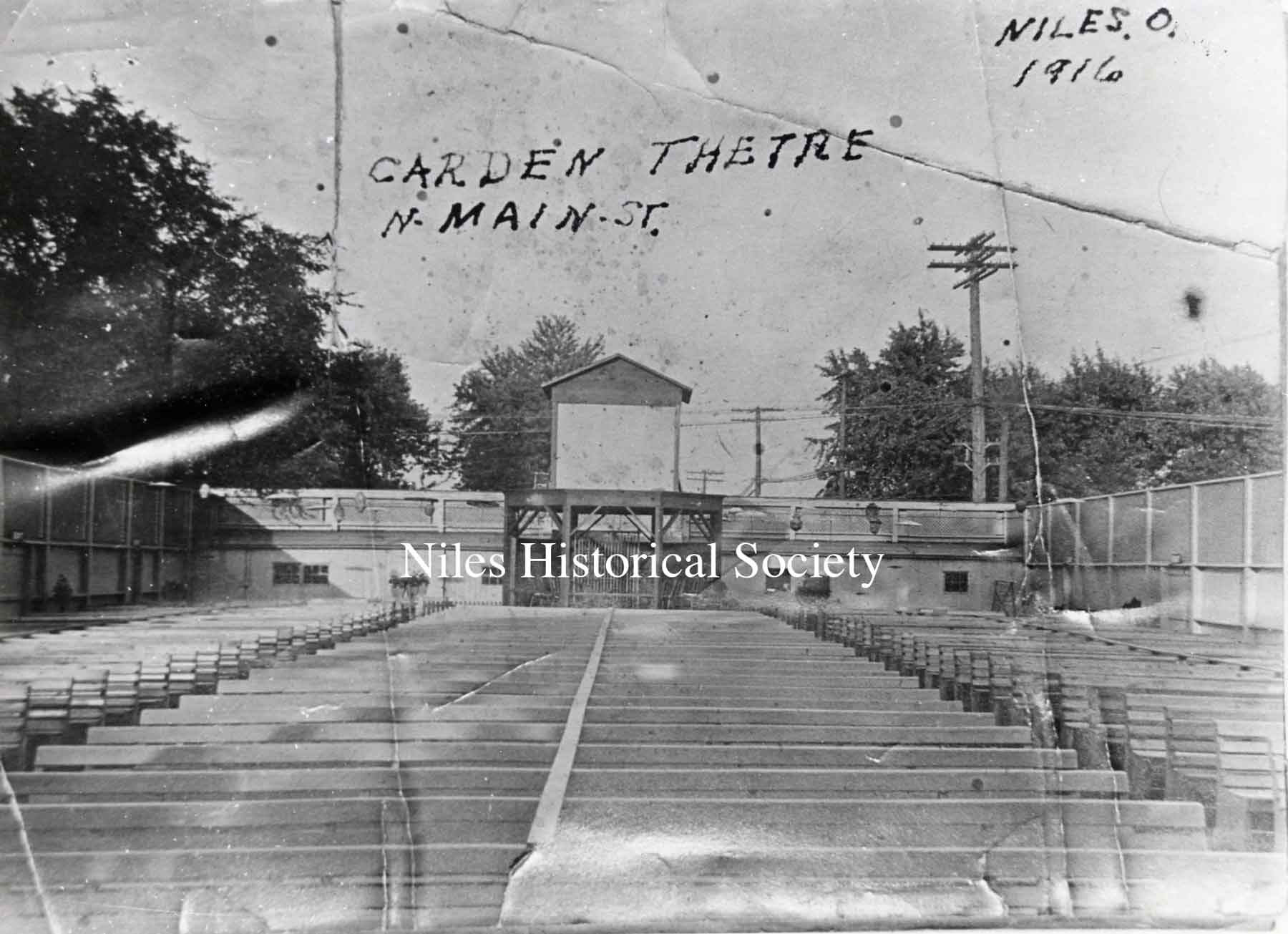 The Garden Theatre was a forerunner of the modern drive-in theatre. Movies were shown in the evening, weather permitting. It was located on North Main Street about where Sparkle Market is now (2001).